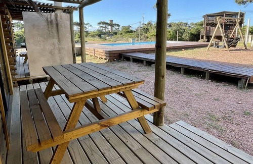 this delightful bungalow features two cozy bedrooms: one with a comfortable double bed and the other with a fun bunk bed, accommodating up to four guests The inviting living area boasts air conditioning, cable TV for your entertainment, and a well-equipped kitchenette for all your culinary needs. Unwind in the hammock or fire up the exclusive Uruguayan grill for a delightful barbecue experience under the stars.