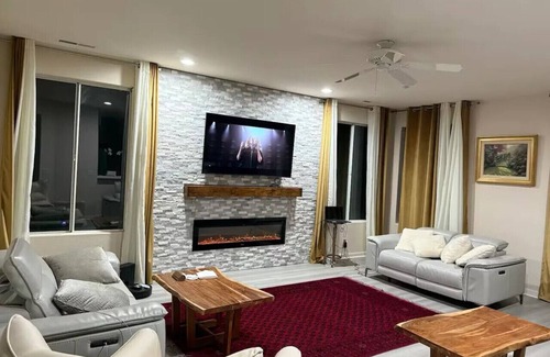 unwind in a warm and inviting living room designed for comfort and connection Whether you’re enjoying a movie night, cozying up by the fireplace, or simply relaxing with loved ones, this space is perfect for gathering together.
