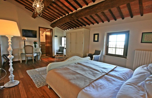 Splendid historic building dating back to 1200, located in central Tuscany west of Siena, recently restored and transformed into a most unique fully equipped. This is a catered villa, serving delicious freshly prepared lunch or dinner, as well as a self-service breakfast included in the price.