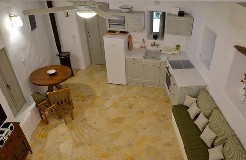 in the ground floor part, you will find a kitchen corner fully equiped (cooker with oven, fridge with deep freezer, coffee maker, espresso machine, toaster, dishes, cooking tools, silverware, etc) and a living space with a built-in sofa, flat screen TV, sound system, old style stove, A.C., ceiling fan, hand made wooden furniture, one king size douple bed, and a bathroom with walk-in shower.