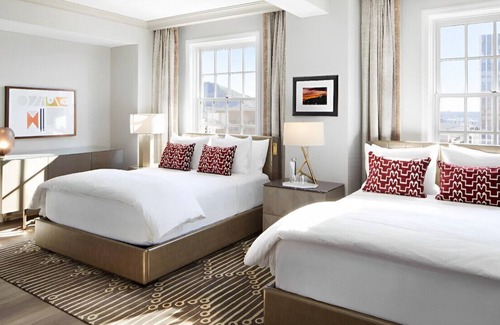 the enchanting desert landscape influences this modern guest room It features a soft burgundy, cream, and champagne palette with five-star amenities. Our dining options are convenient and enjoyable. You can have a good time at the bar without going anywhere outside. Our guests can enjoy on-site restaurants and a fitness center. Miscellaneous fees may be subject to additional costs after booking.