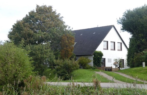 in the west of the peninsula nordstrand we have a large bright apartment on the 1st floor of our house for you There is room for up to 4 people. The house is slightly elevated on an inland dyke with a good view. In the garden there is a seating area with a beach chair, 2 chairs and a table. There is a bench with a view on the dyke, which is often used.