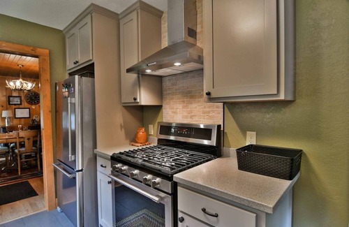 the quaint rustic interior features tongue-and-groove wood walls and ceilings, an antlered chandelier, and a gas stove/fireplace in the dining room and living room There is a large screen, flat panel Smart TV so you can stream your own accounts, WiFi, and board games for your enjoyment. Full bath and bedroom with queen bed and ceiling fan round out this comfortable cabin rental.