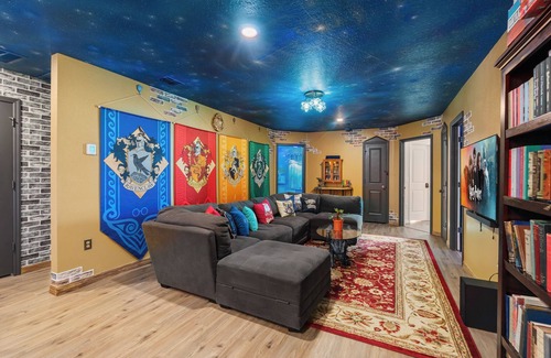 ✹ mandalorian game room & diagon alley loft: enjoy arcade games, pool table, selfie walls, and cozy family movie nights