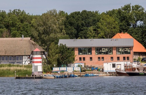 the alte scheune am focker strom attracts the guests from the very first moment on ummanz This is ensured by the unique view of the water, which is close enough to touch and gives holidaymakers an unprecedented holiday experience. But it also depends on the "inner values" and these four cottages with 110 to 130 square meters have on two floors a lot to offer: Starting with the two bedrooms and two bathrooms with floor-deep showers to a sauna and a fireplace, which makes the stay on Ummanz in every season its charm. In the summer you can enjoy the gentle breeze, in the winter you make it in the evening cuddly and cozy. While the spacious sleeping area is located on the ground floor, the upstairs living area impresses with ceilings that are up to four meters high. The luxurious interior is complemented by the fully equipped kitchen, three HDTVs, a hi-fi system, designer furniture and of course wireless internet access. Above all, the view from the living room has its charm, because there you can let your eyes wander over the foothills of the Baltic Sea. The balcony on the west side also invites you to enjoy the sunshine quite relaxed. Excellent location The location "Am Focker Strom", just after the bridge that leads from Rügen to Ummanz, is not only a very personal viewpoint for all guests, but also an excellent starting point to discover the island in all its facets. This includes a walk already the neighboring church, which ensures twice a day with its church bells for an authentic island feeling. These four holiday cottages on Ummanz, which offer ample space for up to four people, are just as brilliant a choice for a family with children as they are for a family with a dog or a solo traveler looking for a relaxing break. A car parking space and covered bicycle storage are part of these holiday homes..