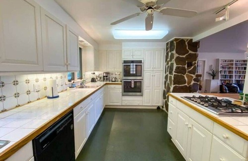 the u-shaped kitchen has plenty of space to cook for a crew, with dual ovens, and a countertop gas range The dining room features an extended table with seating for ten, but be sure to take advantage of the outdoor dining options when the weather is right, there’s a BBQ grill and various seating arrangements - a picnic table on the deck, a four-seat dining table, and the screened in porch, not to mention a poolside dining table in the fenced pool area.