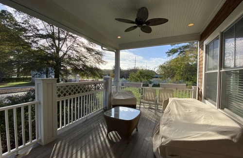 the home is in a peaceful setting right on the edge of the very walkable historic cape charles As one of the few homes in Bay Creek's "Marina East" neighborhood, the home is surrounded by lots of green space and water. All of this behind the gates of Bay Creek on a low traffic street, meaning peace and solitude while sitting on the sizable front porch with your morning coffee or evening cocktail.