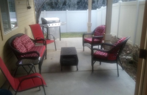 We have a beautiful 3 bedroom single story home for rent which is located in the Treasure Valley area, close to the I-84 corridor. It is within 30 min. of almost everything in the Boise Area. Hardwood floors in entry, dining room and full kitchen which has granite counter tops, stainless steel appliances and full size refrigerator as well. Comfortable living room with 55" flat-screen, satellite TV, DVD, internet, and WiFi. There are two master suites (each with their own full bathrooms) and a 3rd bedroom (w/separate full bathroom sharing with the common areas) featuring Queen Size Beds to sleep 6 comfortably, soaker tubs, designer tile and walk-in shower. Large two car attached garage and a fenced in yard with patio furniture. Settlers Bridge (HOA) boasts a community pool (open from Memorial Day to past Labor Day), tree lined streets, walkways, and playgrounds including a Tot-Lot about 100 yds from the property. We provide pool towels for your convenience. The neighborhood is close to Eagle Road with retail shopping including grocery store..
