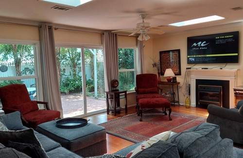 SPACIOUS HOME IN OLD OCEAN SPRINGS , PRIVATE COURT YARD , CAR PORT , SMART T.V. IN LIVING ROOM WITH CABLE AND PREMIUM WI FI , COMFORTABLE FURNISHINGS , KEYLESS ENTERY , SUN ROOM OFF OF MAIN BED ROOM ( KING BD & WALK IN SHOWER ) , BD W/ QUEEN , BED W/ 2 TWIN , NEWER HVAC , SMART T.V. IN EACH BED ROOM. OFFICE DESK, CHAIR, PRINTER AND SHREDDER..