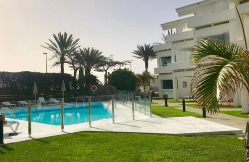 Apartment on the Pedestrian Promenade over Playa del Ingles Beach, next to the Dunes of Maspalomas in a small and calm residence of only 2 floors, surrounded by gardens with direct access to the Pedestrian Promenade just over the Beach. I can go down to the beach by a nearby elevator to restaurants level, and then a few steps to the sand (5 min walking distance to the sand). Then you can walk along the shore to go to the dunes of Maspalomas and nudist area in 15 min.