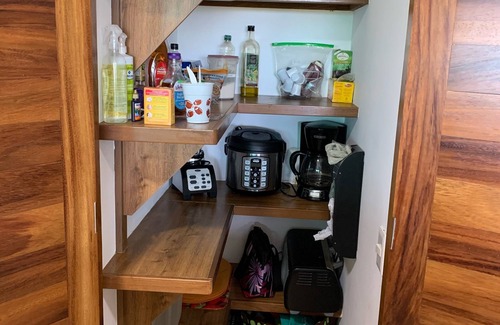 fully equipped kitchen: toaster, toaster oven, coffee maker, blender, gourmet pots and pans, baking dishes, serving bowls, microwave, garbage disposal, full-sized stainless steel refrigerator with lots of ice cube trays
