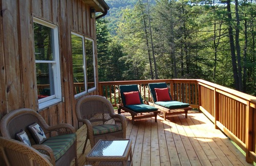 with an open floor plan living area and country kitchen/dining area, the house lends itself beautifully to relaxing and entertaining, with a large deck perfect for sunning, dining al fresco or stargazing The three charmingly decorated bedrooms (including a huge master bedroom with vaulted ceiling, L-shaped couch, and large library table) dramatic wooden beams, two large and comfortable TV areas, and a crackling fire in the woodstove create a wonderfully warm feeling for hosting friends or family. The house is also great for working from home, with three distinct work/study areas, multiple outlets and lightning-fast internet.