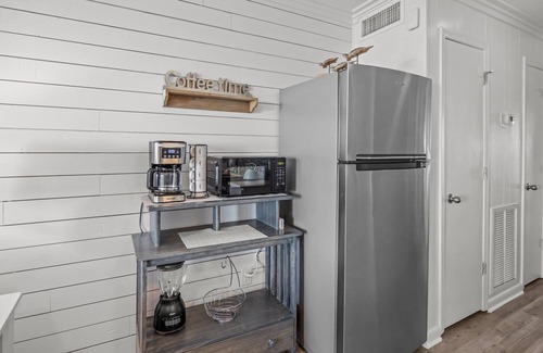 the living space is bright and inviting, with a comfy couch that's just begging for you to curl up with a good book or enjoy a movie night after a day at the beach The kitchen is fully equipped, so whether you want to whip up a romantic dinner or just brew some coffee at the coffee bar, you've got everything you need at your fingertips.