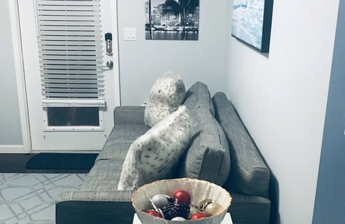 the meticulously appointed apartment has a private entrance with one bedroom, a very comfortable pull-out couch in the living room and a fully-appointed kitchenette You can simply step out of your apartment where you can relax and enjoy the warm Miami weather and tropical breezes..