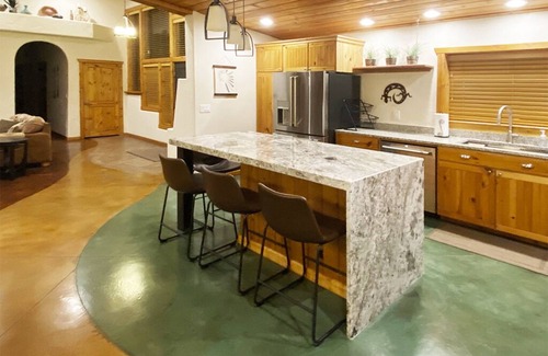 this house is beautifully and newly furnished and has a fully equipped kitchen and great room with game area It has all the necessary amenities including WiFi, smart TV's, fireplace, air-conditioning/heating units, and radiant heating in floors. Each bedroom also has the ability to be individually climate controlled. All floors are beautifully finished stained concrete with area accent rugs.