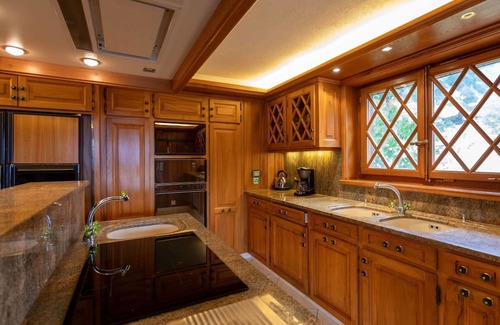 your vacation home comes fully equipped with modern conveniences including a washing machine, dishwasher, open-hearth fireplace, heat availability, microwave, and multiple televisions The open kitchen features four induction hot plates, a toaster, kettle, freezer, and electric coffee machine. The chalet can accommodate up to 10 guests across its 6 bedrooms and 4 bathrooms. Each bedroom is furnished with comfortable double beds, and multiple bathrooms feature bidets and double hand-basins.