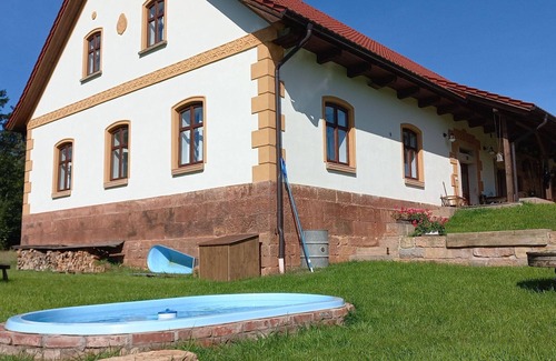 the property is a luxurious farmhouse built in 1868 and renovated in 2021, located in dolní olešnice, 7 km from hostinné It features a private swimming pool (2 x 4 m, depth 120 cm, seasonal availability: 01.Jun. - 30.Sep.), a terrace, garden furniture, a barbecue, a fireplace, and a children's playground with a sandbox. The holiday rental offers amenities such as Internet WiFi, a table tennis table, a billiard table, a table football game, a trampoline, and a washing machine. Parking is available at the house, though the motor access is steep, with a distance of 50 m from the grounds.