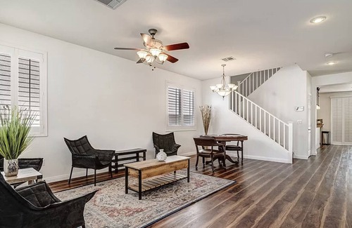 Beautiful 4 bedroom house inside of a Rhodes Ranch sub-community with heated pool, pool table, etc. The house has an upstairs master bedroom, two upstairs regular bedrooms with queen beds, a common area with a pool table, and one bedroom downstairs. This is a perfect home for temporary executive housing..