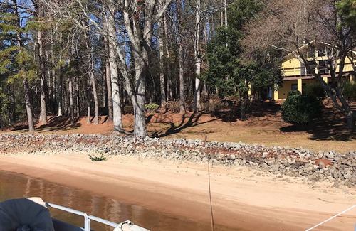 enjoy the lake views from the decks on comfortable furniture Have fun at the lake on our sandy beach in the summer (at normal lake level), using one of our kayaks, or swimming from the boat dock. Tie off your boat at the dock or rent a boat or jet skis at Lake Keowee Boat Marina or High Falls Boat Rentals. Play corn hole on our lawn. In the evening, make s’mores around the fire pit.