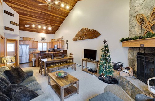 cozy and charming, this bison run property sports a vaulted and beamed ceiling, fully-equipped kitchen, and gorgeous stone fireplace with electric fireplace Ample linens and towels are provided.