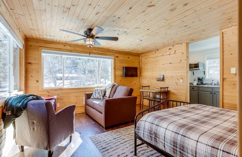walk into this cabin and you immediately feel the coziness with a gas fireplace! we have a soft queen size bed to sleep in after a day of adventuring enjoy sunlight all day long with views of the river in your own private cabin! the mule deer love to walk past in the mornings and the hummingbirds are everywhere!