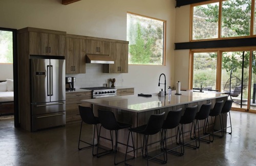 The Birch Creek House is a 1900sqft, 3 bed, 3.5 bath house on 160 private acres 5 miles outside of the City of Escalante. The house is steps away from its name sake, the Birch Creek, which cascades down 2 waterfalls before joining with North Creek to form the Escalante River. The land borders Grand Staircase Escalante National Monument. In addition to the double waterfall mentioned above, the property also features several pictographs, petroglyphs, cliff dwellings of past inhabitants..
