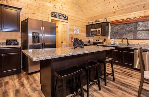 Blue Smoke View is a spacious ADA-friendly three-bedroom cabin located in Bear Cove Falls Resort. The modern cabin sleeps up to 13 guests with two king beds, queen bed, sleeper sofa, two twin bunk beds, futon and 2.5 bathrooms. The full kitchen has beautiful granite countertops and a large center island that are perfect for preparing family meals. Guests can enjoy the beautiful mountain views from a rocking chair or kick back and relax in the jetted 5 person hot tub, all within the screened-in covered patio. Guests will have plenty of entertainment with the cabin's game room, flat screen TVs and a hot tub. Blue Smoke View is only three miles from Dollywood theme park and Dollywood's Splash Country water park. Also, the cabin is just minutes away from other area attractions in Pigeon Forge and Gatlinburg.