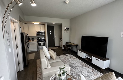 cozy, first floor (accessible via stairs or elevator), stylish apartment with a 65” tv, and views of the skyline Perfect, safe, accommodating stay for visiting Des Moines.