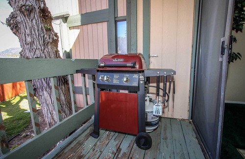 the cozy and warm open floor plan living and dining room area here offers vaulted ceilings and bay views from the big open windows along with another private balcony with outdoor patio furnishings and a propane bbq for you to grill up your freshly caught dinner from the lake You will love snuggling up on the cozy couch and warming your toes together in front of the toasty wood burning fireplace as you watch the snow falling out over the bay and pop on a movie on the flat screen TV with complimentary Cable and hi speed WIFI internet provided by the owners for your enjoyment. The guest bedroom and bathroom are easily accessible from here, also made up for your group with warm linens, blankets, pillows, and fresh shower towels for your vacation when you arrive. boulder creek is a wonderful vacation destination pairing the necessities and comforts from home with a prime boulder bay location- you have endless possibilities at your fingertips from here!
