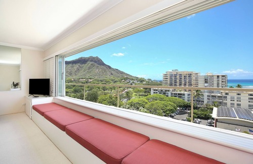 stunning ocean and diamond head views! this spacious (853 sq ft.) open floor plan suite is the perfect spot to enjoy Hawaii's cool trade winds and refreshing ocean breeze. Featuring a full kitchen, free parking, free Wi-Fi, and more, it is an ideal getaway for couples and solo travelers. 2-person max.