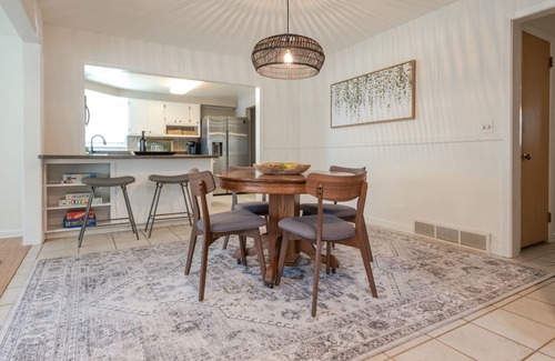 This sophisticated mid-century modern home is filled with charm and warm updates. It’s centrally located close to hospitals and local attractions but is also perfect for a night in watching movies, cooking a meal, or spending time with family. Sleeps 6-7 (2 queen beds, 1 sofa, 1 queen air mattress). This open floor plan features 2 bedrooms, 1 bath, living room, sunroom, dining room, fully stocked kitchen with breakfast bar, laundry, and off-street parking. There’s plenty of room, and it’s loaded with everything you’ll need to feel at home. Guests will have access to entire backyard with private entrance in rear of home off of driveway. Self-check-in. Door code will be provided in email the day of arrival. Easy access to I-229, 41st Street, Minnesota Ave Phillips Ave. (downtown), hospitals, Augustana University, University of Sioux Falls, as well as bike trails, parks, local frisbee golf course, soccer and baseball fields. Walking distance to grocery store, playground, and public transportation..