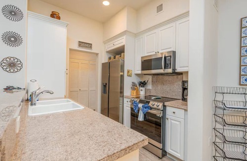 as you walk into this beautiful villa, you are greeted by a newly furnished living area that radiates comfort and style The bright and cheerful open floor plan ensures a relaxing and enjoyable experience. The new flooring throughout adds a touch of elegance and freshness to the space.