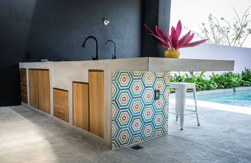 the structure itself features rustic, raw concrete, combined with refined details such as locally sourced roble wood cabinetry and custom, handmade mexican tilework from nearby jalisco