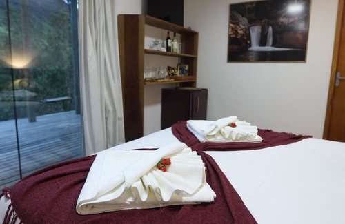 but the real highlight is the veranda, which offers a stunning wooded view where you can relax in the spacious horizontal hammock, enjoying the fresh mountain breeze and the natural wonders that surround the site To complete your relaxing experience, a beautiful hydromassage awaits you, ideal for enjoying moments of tranquillity under the starry sky of Itatiaia.