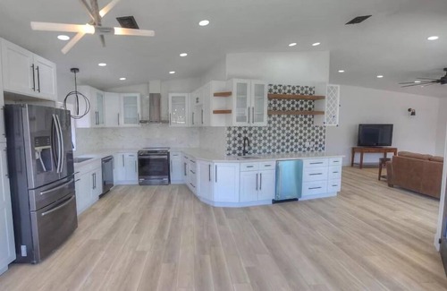 the bushmaster, located on the keys in parker, az, is a luxurious waterfront vacation rental offering a serene desert getaway This well-appointed home features three bedrooms, a fully equipped kitchen with modern appliances, and a spacious living area. Guests can enjoy amenities like free Wi-Fi, a TV, a washing machine, and plush linens and towels. The property boasts direct access to a canal, perfect for docking boats. It is located near local attractions such as the Emerald Canyon Golf Course and Blue Water Marina Park, making it an ideal destination for relaxation and recreation.