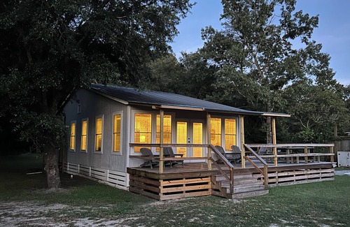 Cozy private getaway located on French Quarter Creek, within the Cooper River Watershed and adjacent to the Francis Marion National Forest. The cabin has been completely remodeled and is approximately 1,000 square feet with 2 bedrooms (1 queen and 4 singles in the bunk room) and 1 bathroom. The living room is loaded with windows and overlooks the backyard and French Quarter Creek. The cabin sits on almost an acre and is very private, being the last house on the road. The huge deck runs the width of the cabin and overlooks the creek. Off the beaten path, but close to everything. 10 minutes from Shipyard Park, 20 minutes from Mt Pleasant, 30 minutes from Daniel Island, and 45 minutes from downtown Charleston.