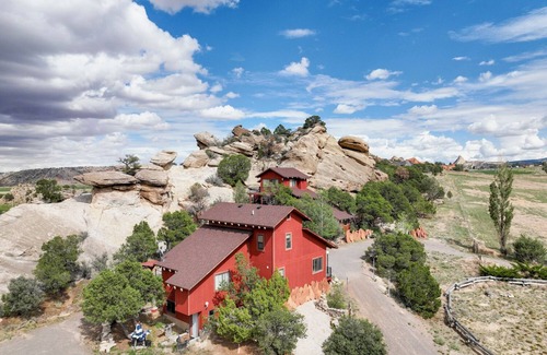 A couples’ retreat, the Canyon Wren Cottage is sculpted into bedrock amongst pinion pines and old growth mountain mahogany brush. A picturesque erosion sculpted sandstone monolith rises four stories at the edge of the yard, just beyond the cottage. The approach to the cottage from Teasdale Road, is down a short lane crossing through woodland fringed meadow with a wetland on one side and alfalfa cultivation on the other. The backdrop is beautiful rock form, including a large balanced rock..