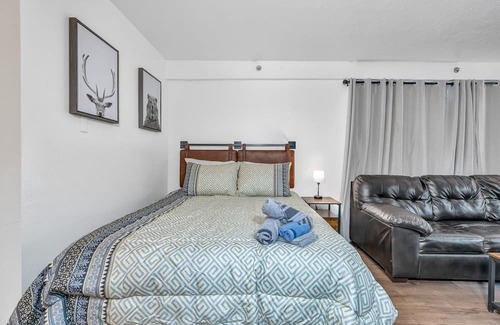 this studio home comfortably sleeps 4 guests between a queen size bed and a queen size sleeper sofa, both fitted with crisp linens and soft blankets for a great night’s sleep The home’s full guest bathroom includes a single vanity and an updated shower/tub combo.