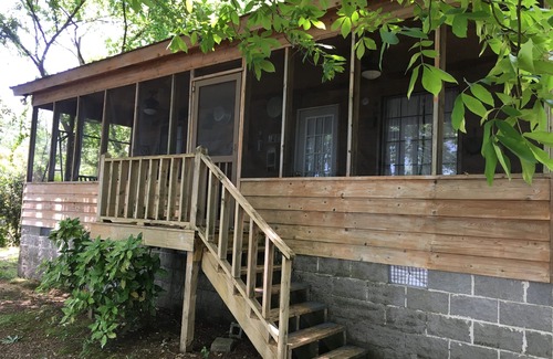 Now with WIFI ! Rustic cabin with modern amenities . Pets welcome . On Second Creek Lake off Pickwick Lake, Tennessee River. 840 County Road 78, Waterloo, AL. Sleeps 10. washer and dryer. Full kitchen. full bath . Directv. Two bedrooms downstairs; king size bed in one and queen in the other. Upstairs loft is one big room with two full beds, bunk beds, and a single bed. Cell phone service. On lake with pier. Nice shaded lot with gradual slope.Great pier and spot for boats. No Smoking-can smoke on screened in porch. Plenty room for parking for trucks pulling boats ..