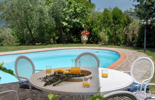 the pool is located a few meters from the house, on the second level of the garden; it is accessed via a stone staircase or along a path in the lawn Irregularly shaped, it measures about 12 x 10 m with a depth varying from 1.20 to 1.80 m; it is covered in PVC and bordered with terracotta finishes; access to the water is via a Roman staircase. The pool is equipped with internal lighting and a chlorine purification system. The surrounding solarium area is partly paved with stone and partly with lawn; it is furnished with sun loungers, umbrellas, tables and a lounge area. In this same area there is also an outdoor shower and a 2 x 2.20 m heated hot tub, with three seats. The pool is open from the last Saturday in April to the first Saturday in October.
