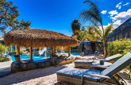 what’s there not to like? everything is a blast! this amazing mansion is fully equipped with 2 pools to choose from and either one can be heated Enjoy a double waterfall, a slide for your youthful glee, a spa to relax your nerves, a swim-up bar for your favorite drink, a cave cabana and submersible bar stools and table.