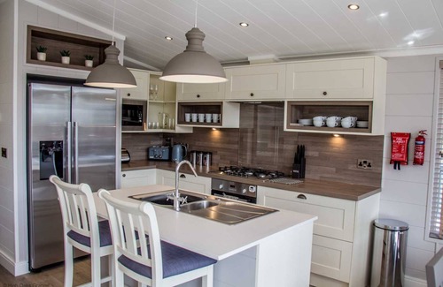 the fully-equipped, shaker style kitchen features everything you will need for a self-catering stay, including a large fridge freezer, a gas hob, an oven, and an island breakfast bar, which houses the dishwasher and wine cooler Adjacent to the kitchen sits a stylish dining area with a large dining table and chairs, big enough for the whole family. Along the corridor you will find two beautifully appointed king-size bedrooms with ensuites, along with two further twin rooms and an impressive family bathroom.