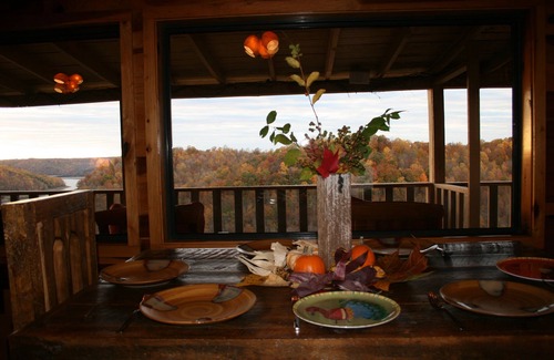 this rustic cabin is wonderfully decorated, boasting numerous antiques and furnishings constructed out of reclaimed timber, some from the old jim beam distillery in nearby kentucky All bedrooms feature luxury linens including 300+ thread count sheets, down comforters and pillows. Comfortably from any one of the three decks you can sun, grill, dine, enjoy music, soak in the hot tub while watching the sunset and stargazing. The (provided) telescope will give you a guided tour of the universe. The main living room has a 55" LCD TV with satellite TV, DVD player and a cozy fireplace. In the bonus room we have an additional 40" flat panel TV with DVD, wet bar and wifi internet. Just outside the bonus room is a free standing hand chiseled stone fire pit with wooden benches.