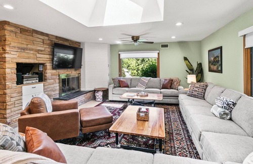 living room • gather the entire group to watch a movie or play a game while listening to one of the many vinyl records from our collection or use bluetooth for your own playlist The sofa and chairs comfortably seats 16.