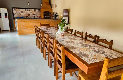 Located in the center of the town, with good accommodation, swimming pool 6x3m, masonry barbecue, garage, soccer field, green area, leisure, 4 bedrooms and 1 suite with 1 double bed and 1 single bed, 1 bedroom with 2 bunk beds and 1 single beds, 1 bedroom with 1 double bed and 1 external bedroom with 1 double bed, 3 bathrooms and 1 external, kitchen complete with utensils, living room with TV, wifi..