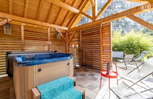 Individual chalet on the owners' property. Private parking next to the chalet. Access by an external staircase (4 steps). Living room-kitchen area with stove and reversible air conditioning, mezzanine (height less than 1m80 - 2 single beds 90x190 cm), sleeping area (separated by a piece of furniture from the wellness area, no partition - 1 double bed 160x190 cm) and wellness area with hammam and 2-seater sauna. Semi-enclosed outdoor area with 6-seater spa (17 m2), private wooden terrace and large shared garden. At the foot of the Beauvoir, in the Chartreuse massif, discover this intimate and peaceful address where you can stay to enjoy its wellness facilities: spa, hammam and sauna. The beautiful south-facing wooden terrace is equipped with a hammock, the spa area opens or closes to admire the landscape as you wish. Very good comfort, pretty garden..