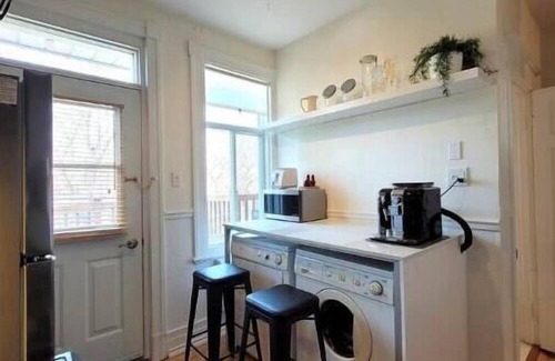 the bathroom has a full sized tub with massage shower and large mirror vanityThe kitchen is fully equipped, with a fridge, stove, washer, dryer and many small appliances including a Saeco bean-to-cup espresso machine, toaster oven, microwave, kettle, popcorn maker, air fryer, coffee grinder, etc. A window AC, portable oscillating fan, dishes, cups, cutlery, utensils, pots & pans, baking trays, extra linens, vacuum cleaner, etc. are all provided to make you feel even more at home during your extended stay.