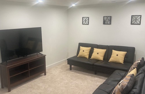 Stay comfortably in Saratoga Springs at this 2-bedroom basement apartment. This delightful property features 2 queen beds, 1 sofa bed, and 2 futons, perfect for a tranquil getaway. With 2 bathrooms and a cozy living room with 4 twin folding mattresses, guests will have plenty of space to relax. Enjoy amenities like fully equipped kitchen, dishwasher, large refrigerator, WiFi, a washing machine, a dryer, and AC and heat during your stay. You're sure to make fantastic memories with a stay at our place. 5 minutes drive to all shopping and restaurants..