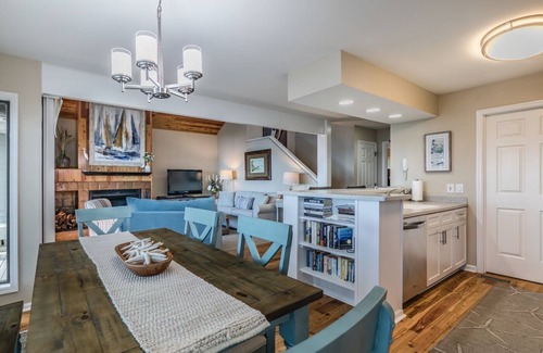 all of the furnishings have been re-done providing a comfortable coastal vibe The first floor has an open concept, fully equipped kitchen that is open to the 2 story living area with wood burning fireplace and a comfortable dining room that seats 6. A wall of windows provides magnificent coastal water views from every angle. The living room has plenty of seating to enjoy watching TV, reading a book, or the changing tides. A gas grill is provided for cooking out.