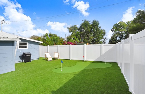 the kitchen is equipped with all the essential appliances and utensils you need to prepare delicious meals during your stay When it's time to rest, you'll find three cozy bedrooms that offer a peaceful night's sleep. Each bedroom features comfortable furnishings and ample storage space to make you feel right at home. The 1.5 bathrooms are modern and well-maintained, ensuring your comfort and convenience. In addition, the home has a separate laundry room with a starter kit for your convenience. The garage is set as a game room where you can engage in shuffleboard, chess, checkers and several other board games. One of the highlights of this rental is the outdoor space. Step outside to the fully fenced private backyard, where you can savor your morning coffee, relax, grill out, try your luck at chipping or putting, cornhole or enjoy some time around the firepit. Enjoy the Florida weather with many outdoor activities. The home is 2 blocks off quaint downtown Dade City. Dade City itself is a charming town with a rich history, offering a unique blend of small-town charm and modern convenience. Explore the local shops, dine at delicious restaurants, and immerse yourself in the warm and welcoming community. Downtown Dade City is filled with boutique and antique shopping, great cafés and restaurants, wine bar and brewery as well as some great little bookstores. The town hosts several seasonal events for all ages, that are sure to make your stay with us memorable.